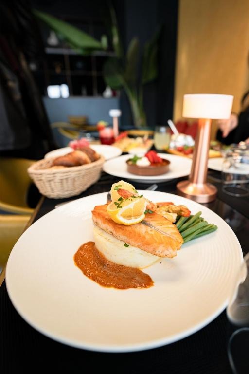 Expérience Culinaire: Le restaurant propose une cuisine internationale avec des options halal, végétariennes, véganes, sans gluten et sans produits laitiers. Un bar offre une variété de boissons.